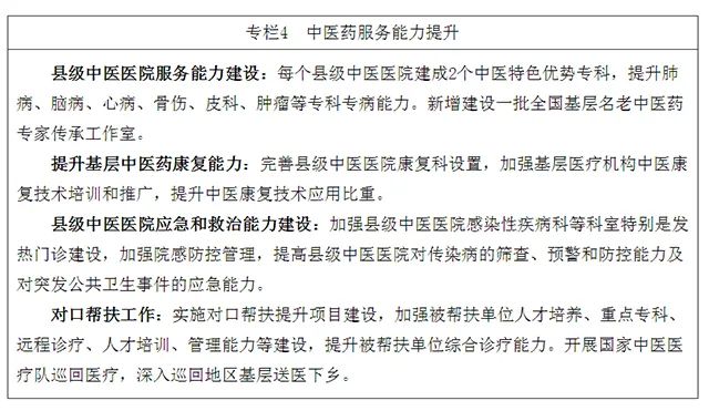 1.发挥县级中医医院龙头带动作用。落实《中华人民共和国中医药法》和《中共中央 国务院关于促进中医药传承创新发展的意见》要求,原则上每个县办好一所县级中医类医院,有效承担县域居民常见病、多发病中医诊疗和急危重症抢救与疑难病转诊任务。支持县级中医医院能力建设,提升县级综合医院、专科医院、妇幼保健机构中医药服务设施配置,中医临床科室、中药房、煎药室设置达到医院中药房、医疗机构中药煎药室等国家标准,鼓励县级妇幼保健机构设置中医妇科、中医儿科。
