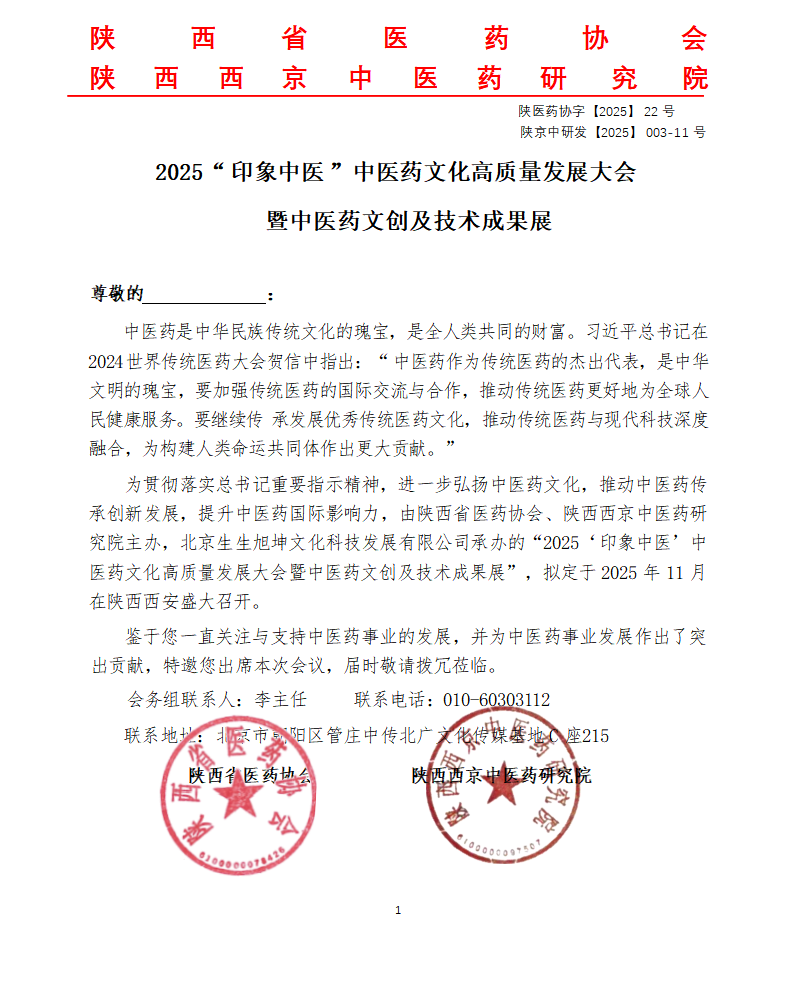 中医药是中华民族传统文化的瑰宝,是全人类共同的财富。为贯彻落实总书记在 “2024 世界传统医药大会”贺信中重要指示精神,进一步弘扬中医药文化,推动中医药传承创新发展,提升中医药国际影响力,由陕西省医药协会、陕西西京中医药研究院主办,北京生生旭坤文化科技发展有限公司承办的“2025‘ 印象中医’中 医药文化高质量发展大会暨中医药文创及技术成果展”,拟定于 2025 年 11 月28日至30日在陕西西安盛大召开!