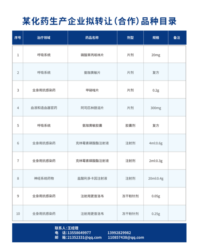 化药生产企业拟转让(合作)品种目录